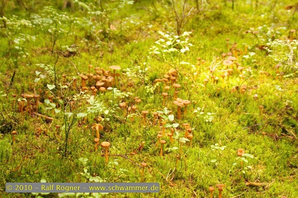Einige Pfifferlinge gesellten sich sogleich hinzu und nachdem ich mich von Erika am finalen Startpunkt absetzen ließ, ging es quer durch einen sehr feuchten, moosigen Mischwald, der von gigantischen Kolonien des Grüngelben Gallertkäppchen überzogen war. Wohin man auch blickte standen hunderte dieser Pilze (Archivfoto):
