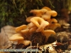 Es ging dann schnurstracks zurück zur asphaltierten Waldstraße, um in einen anderen Abschnitt zu gelangen. Dort fand ich einen Schirmpilz, den ich noch nicht hundertprozentig bestimmt habe, aber mit sehr großer Wahrscheinlichkeit ist es ein persönlicher (bewusster) Erstfund, nämlich der Safranschirmling (Chlorophyllum rhacodes). Leider waren die örtlichen Verhältnisse so ungünstig, dass ich keinerlei Möglichkeit hatte ein Bild am Standort aufzunehmen. Aber ein Foto von vertrockneten Riesenexemplaren des Hallimasch konnte ich dort auf Distanz einfangen: