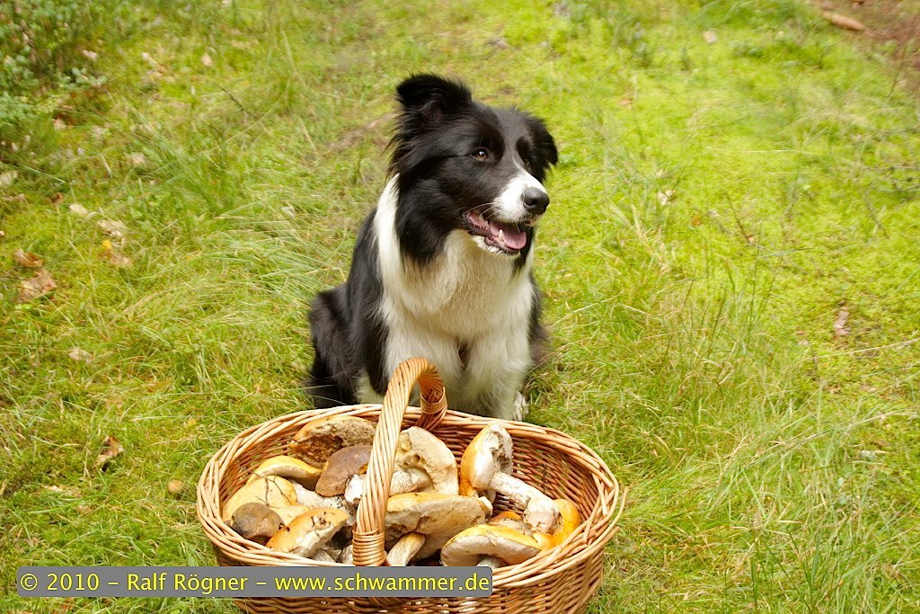 Einige Meter weiter sah der Baumbestand identisch aus, also ging es noch einmal in dieses Dickicht und schon nach wenigen Metern weitere Rotkappen, eine schöner als die andere. Weitere Milchbrätlinge und selbst ein Steinpilz standen in diesem dunklen Wald und in Nullkommanix war mein Korb nun vollständig gefüllt. Ich begab mich zurück auf den Weg – ein kleiner Eindruck vom Korb, der von Molly bewacht wird: